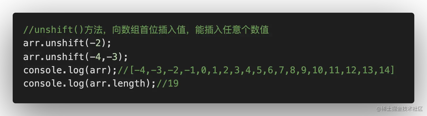- 方式二:通过unshift()方法,向数组头部添加元素,能添加任意多个值