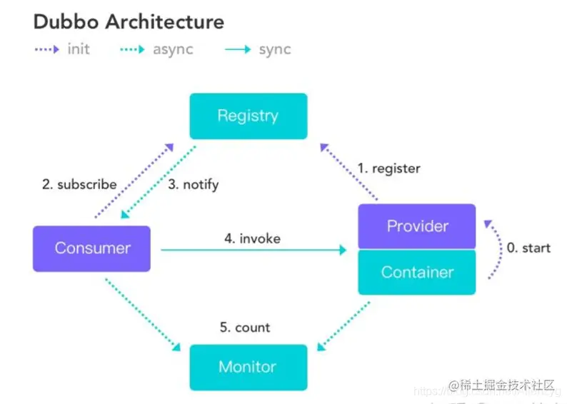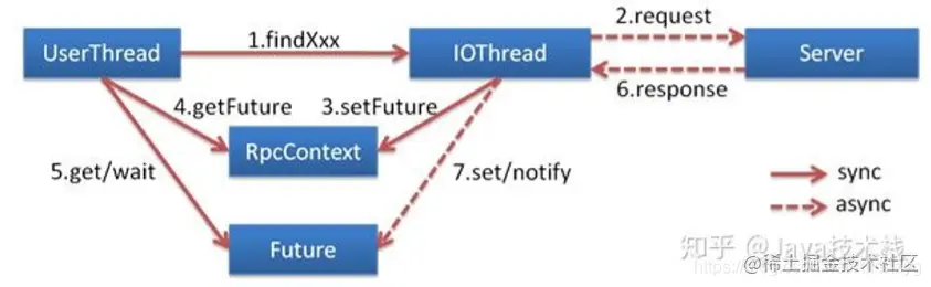 默认是同步等待结果阻塞的,支持异步调⽤。 Dubbo 是基于 NIO 的⾮阻塞实现并行调⽤,客户端不需要启动多线程即可完成并行调用多个远程服务,相对多线程开销较小,异步调⽤会返回一个 Future 对象。 异步调用流程图如下。