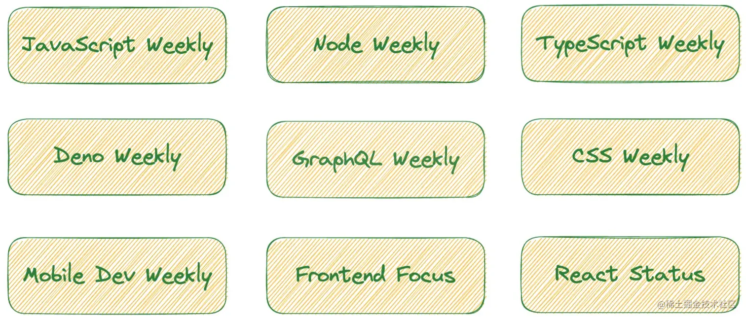 通过分析这些热榜文章,你就可以找到一些写作热点。另外,我的 QQ 邮箱有订阅一些不错的 Weekly。比如:JavaScript Weekly、Node Weekly、TypeScript Weekly 和 React Status 等。这些 Weekly 每周会推送一些不错的文章或开源项目。这些 Weekly 提供的信息,也是我选题的一些素材来源。
