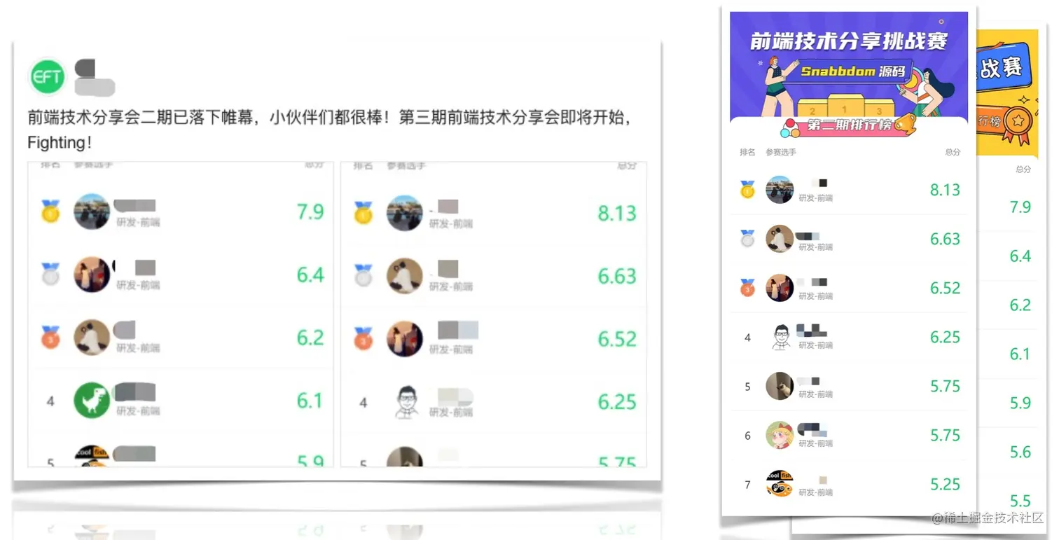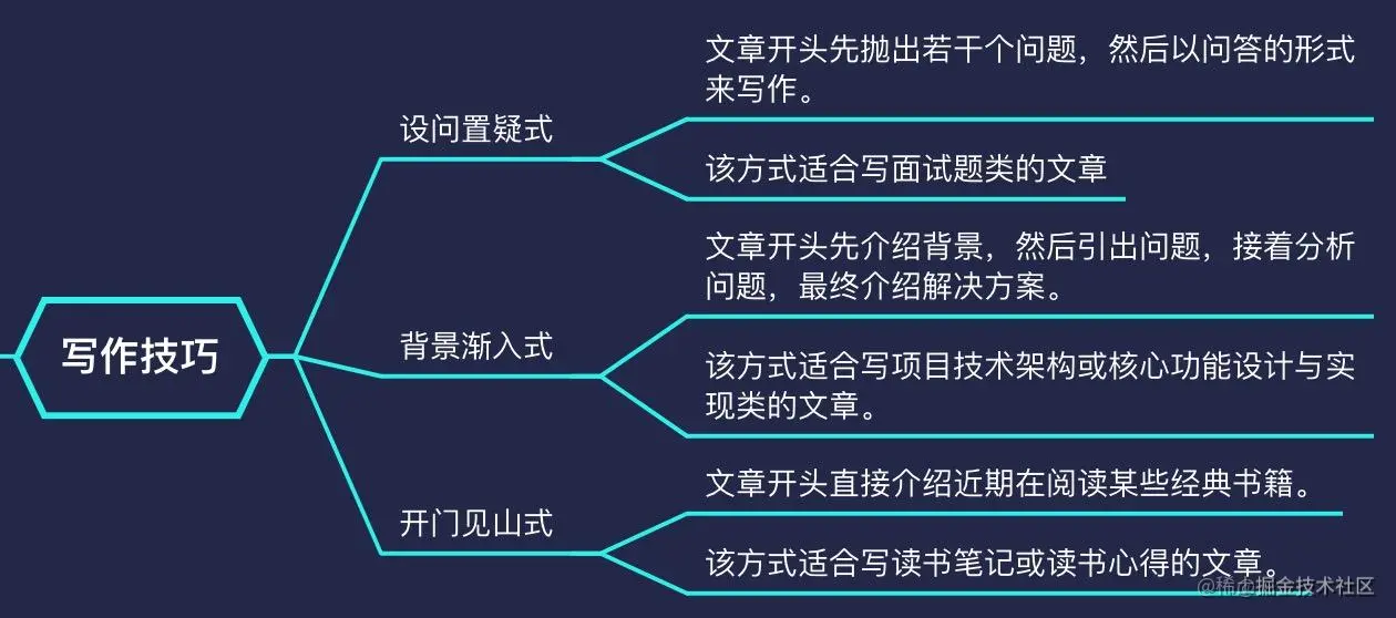 我们公司前端团队中的一些小伙伴此前也有和我聊过一些写作方面的困惑,他们不知道写什么内容,也不太敢尝试写作。后面我就以技术分享的形式,来推动他们写作。我会定期选择一些技术分享专题,比如 设计模式专题、Webpack 专题和 Vue2 源码专题,然后让他们每个人都去准备对应的分享内容和对应的技术文章,接着让他们在组内进行分享,参加分享会的同学会对分享的内容进行打分,最终我们会评选出每次分享会的前 3 名,给出一定的奖励并且会在公司内部平台进行宣传。通过这种方式,让他们踏出第一步,慢慢养成写作的习惯。