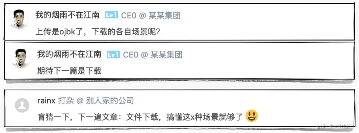 既然掘友有要求,连标题也帮我想好了,所以后面我又写了一篇 文件下载,搞懂这9种场景就够了 的文章。在写作的过程中,同样也是先梳理大纲,然后再对大纲进行二次加工。等文章脉络清晰了之后,才会动手开始完善文章中每个章节的内容。