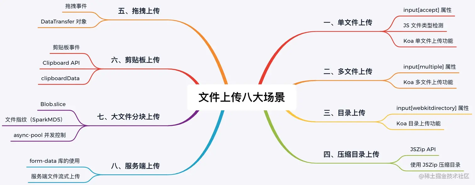 受到这个的启发,我就想到了日常工作中,文件上传的场景。所以我就先根据以往的经验,梳理了文件上传、多文件上传、拖拽上传和剪贴板上传的场景。之后,我就使用 文件上传 关键字,在掘金、谷歌、百度等平台上搜索相关文章,进而不断完善大纲。在初步整理完大纲之后,我就会对大纲的内容进行二次加工,比如进行筛选和排序。