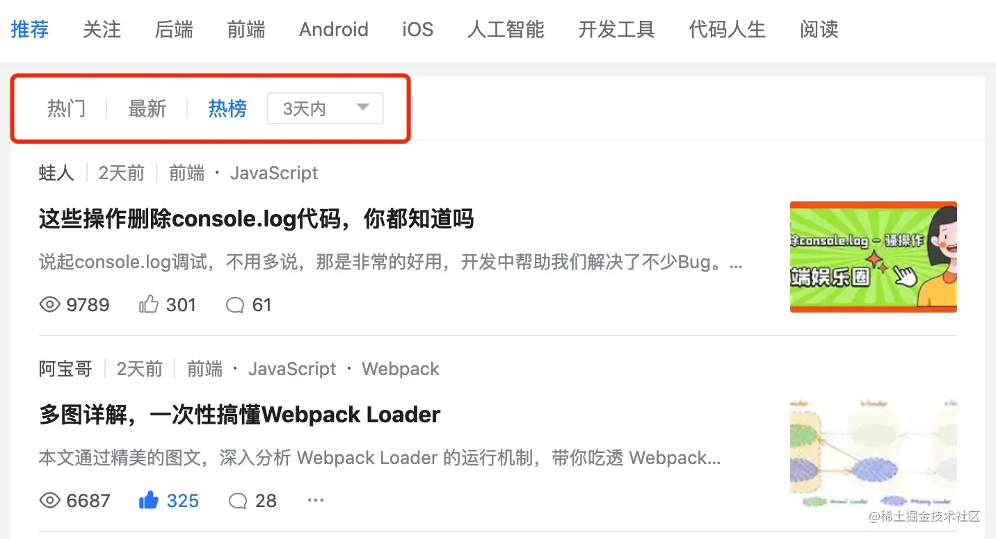 而其他的写作方向,大家可以参考技术社区的文章排行榜或分析你所关注的技术大佬,也可以找到一些写作的主题。比如通过掘金首页 —— 推荐栏位,就可以看到 热门、最新和热榜 的文章: