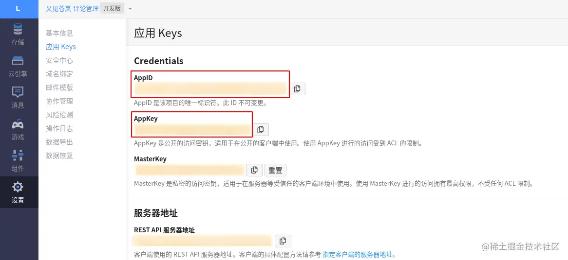应用 Keys,右边AppID和AppKey就是我们需要的标识和密钥。
