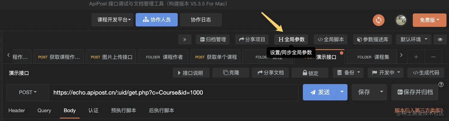 前面的示例中,我们都是在单一接口中填入不同的请求header、query、body参数。但在实际项目中,对于一批接口,往往具有相同的请求参数。此时,我们可以利用全局参数或者目录参数实现。