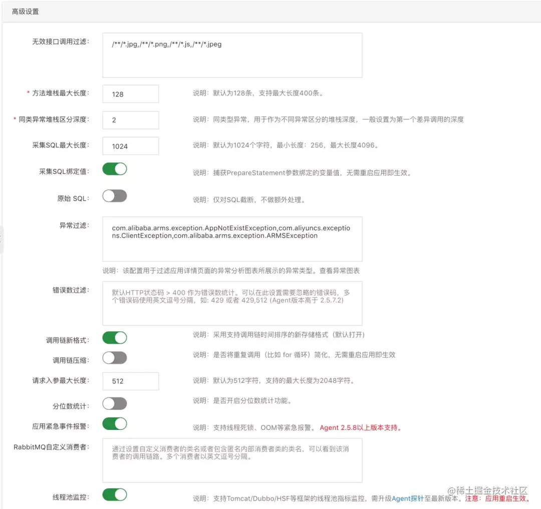 无论是动态降级还是动态开启,都需要在不重启应用的前提下进行动态配置下推。而开源 Trace 通常不具备这样的能力,需要自行搭建元数据配置中心并进行相应的代码改造。而商业化 Trace 不仅支持动态配置下推,还可以细化到每个应用独立配置,比如应用 A 存在偶发性慢调用,可以开启自动慢调用诊断开关进行监听;而应用 B 耗时对 CPU 开销比较敏感,可以关闭此开关;两个应用各取所需,互不影响。