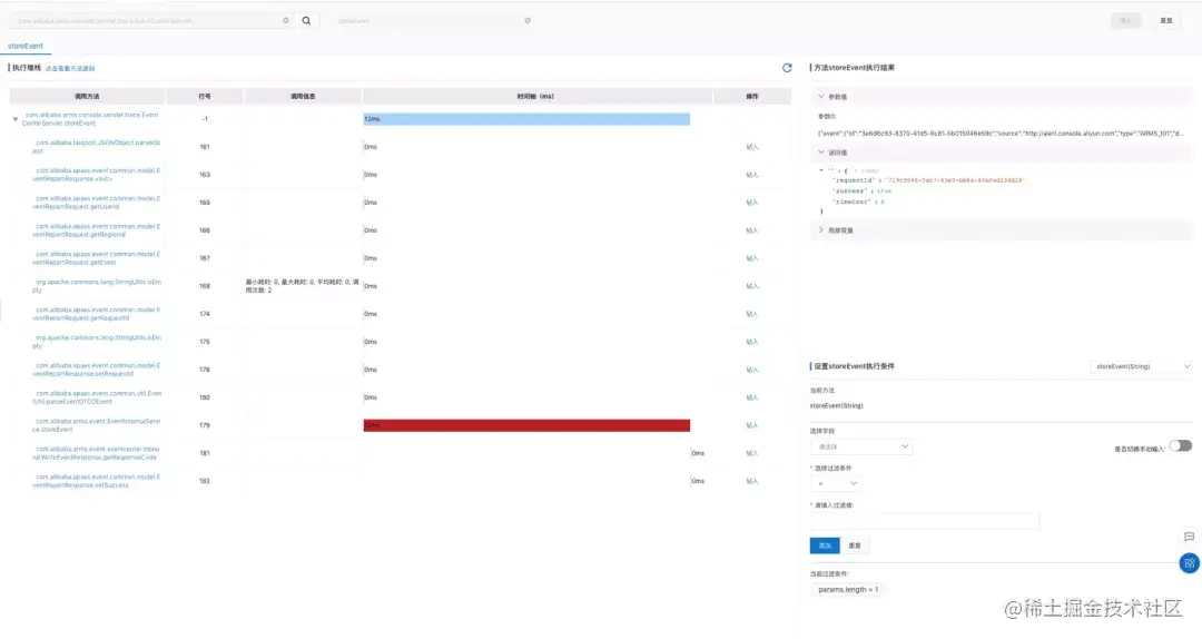 为了解决线上运行代码不符合预期的问题,我们需要一款在线调试诊断工具,能够实时查看当前程序运行态的源代码、出入参、执行方法栈与耗时、静态对象或动态实例的值等等,让在线调试就像本地调试一样方便,如下图所示: