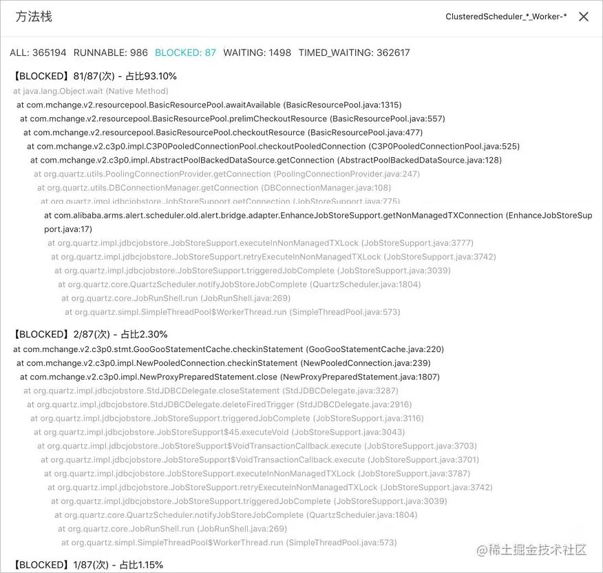 第二种就是提供常态化线程分析功能,能够自动记录每类线程池的状态、数量、CPU 耗时和内部方法栈。在任意时间段内,点击按 CPU 耗时排序,就可以定位 CPU 开销最大的线程类别,然后点击方法栈,可以看到具体的代码卡点,如下图所示有大量 BLOCKED 状态的方法卡在数据库连接获取,可以通过调大数据库连接池来优化。