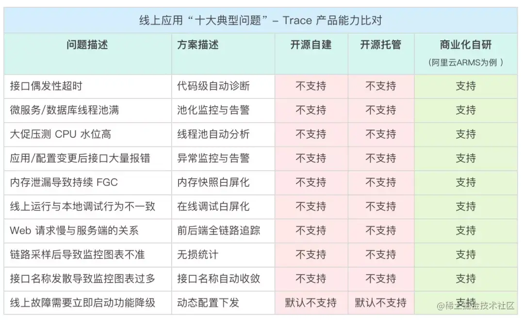 综上所述,线上应用为了保障最终的业务稳定性,在做链路追踪方案选型时,除了 Trace 通用基础能力外(如调用链、服务监控、链路拓扑),还可以参考下面列举的“十大典型问题”(以 Java 应用为例),综合对比开源自建、开源托管与商业化自研 Trace 产品的差异化表现。
