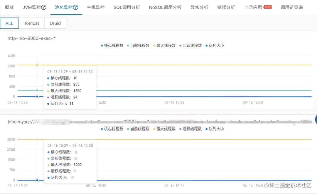 而商业化自研 Trace 提供的池化监控可以直接看到指定线程池的最大线程数、当前线程数、活跃线程数等,线程池耗尽或高水位风险一览无余。此外,还可以设置线程池使用百分比告警,比如设置 Tomcat 线程池当前线程数超过最大线程数 80% 就提前短信通知,达到 100% 时电话告警。