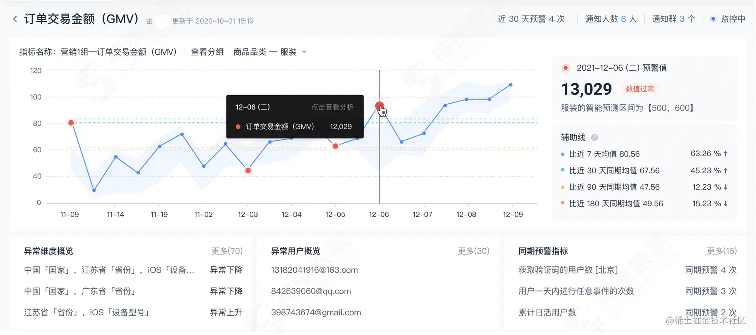 最后,运营同学使用智能预警分析的同期指标预警能力,从历史异常行为序列上,直接定位出现问题的环节。同时,利用指标关联分析,自动分析与报警指标存在正负相关的指标,并站在整体业务的视角,定位真正问题的同时,发现其他可能受到影响的业务,真正成为拥有“全局视角”的团队。