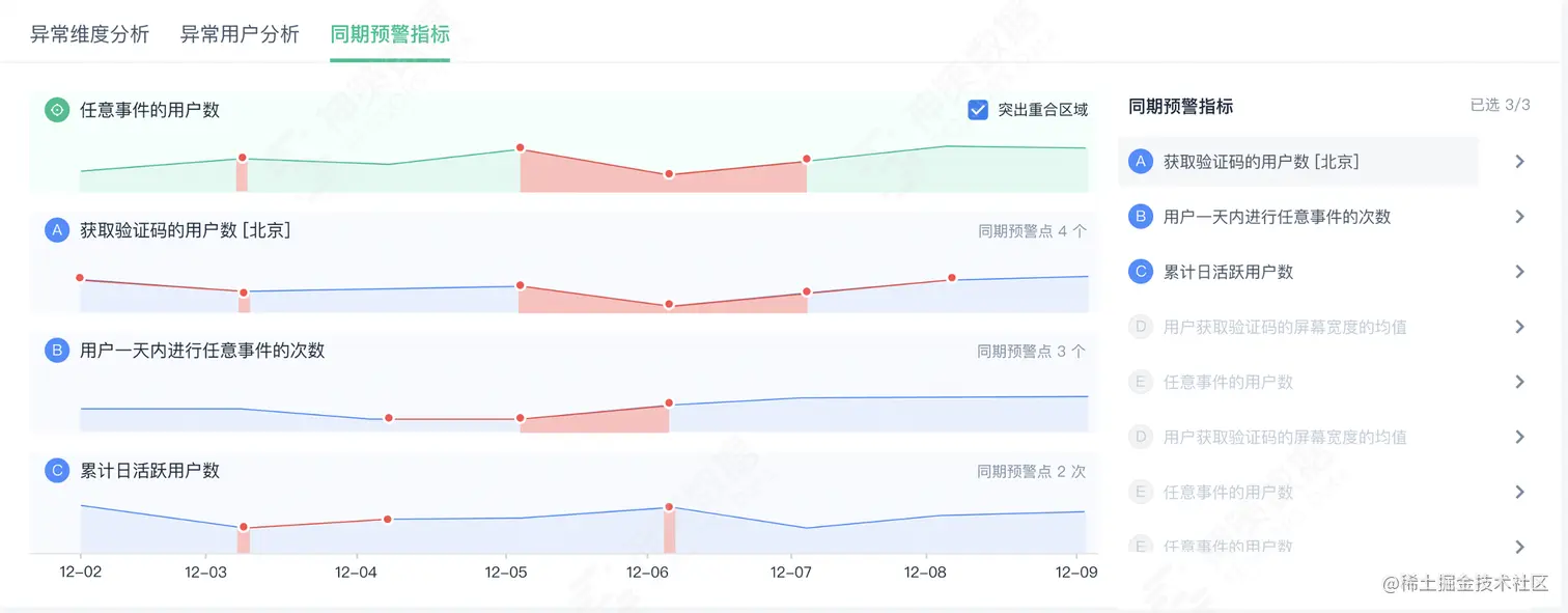 智能预警分析的自动化分析能力,不仅可以帮助企业自动化定位异常维度和异常用户,还可以根据指标时序关联,帮助企业快速找到与预警异常点发生重合度较高的指标,进一步分析同期预警指标是否有相同或相关联的诱因。