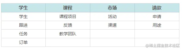 其他:还有很多细节的对象,例如对服务跟进、销售反馈、考试数据、学校信息、城市数据、教学团队信息以及费用报销支出的管理,设计环节相对单一还是比较好处理的。