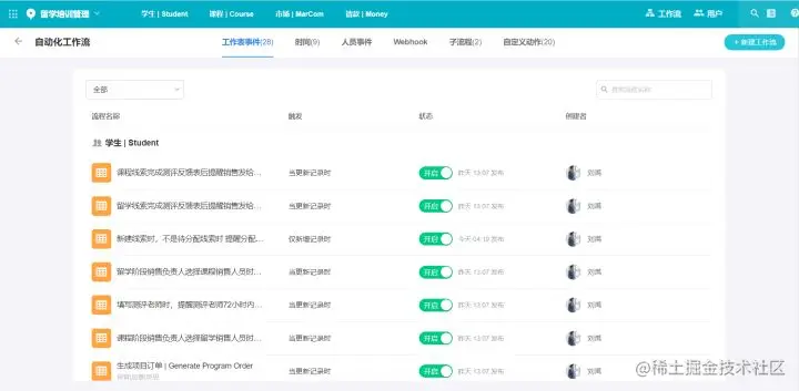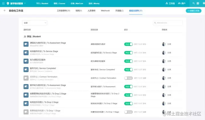 其他流程:除此之外包含各类定时触发流程用于任务、考试、上课、反馈等场景。以及很多辅助实现订单关联学生,课程关联订单等辅助类型的工作流配置。