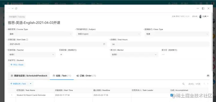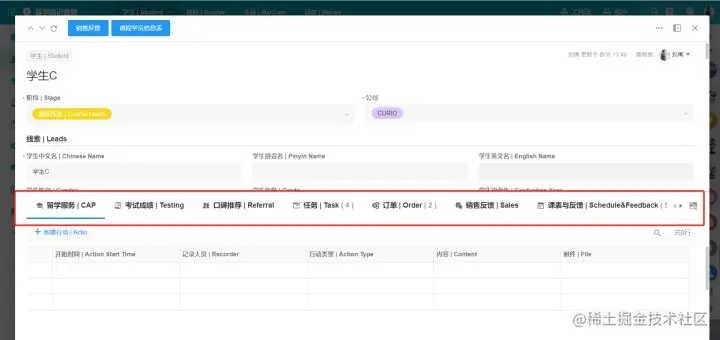可以录入并查询到学生自身信息,以及也包含与之相关联的跟进、订单、任务、课程等信息。