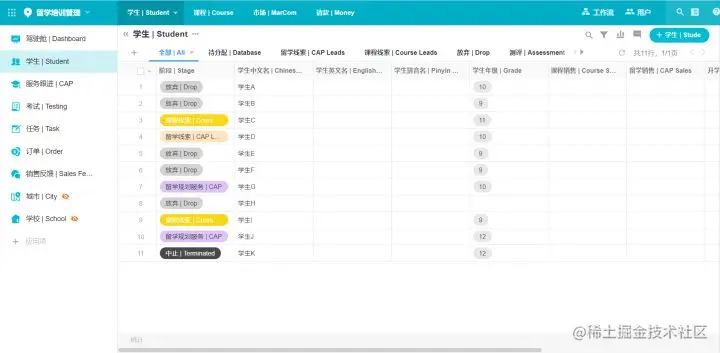 学生:作为整个业务中贯穿始终的对象,从最初的来源信息、学生基本信息、销售分配、学校报名信息、签约的订单、安排的课程、学生反馈等,贯穿整套系统的数据结构。