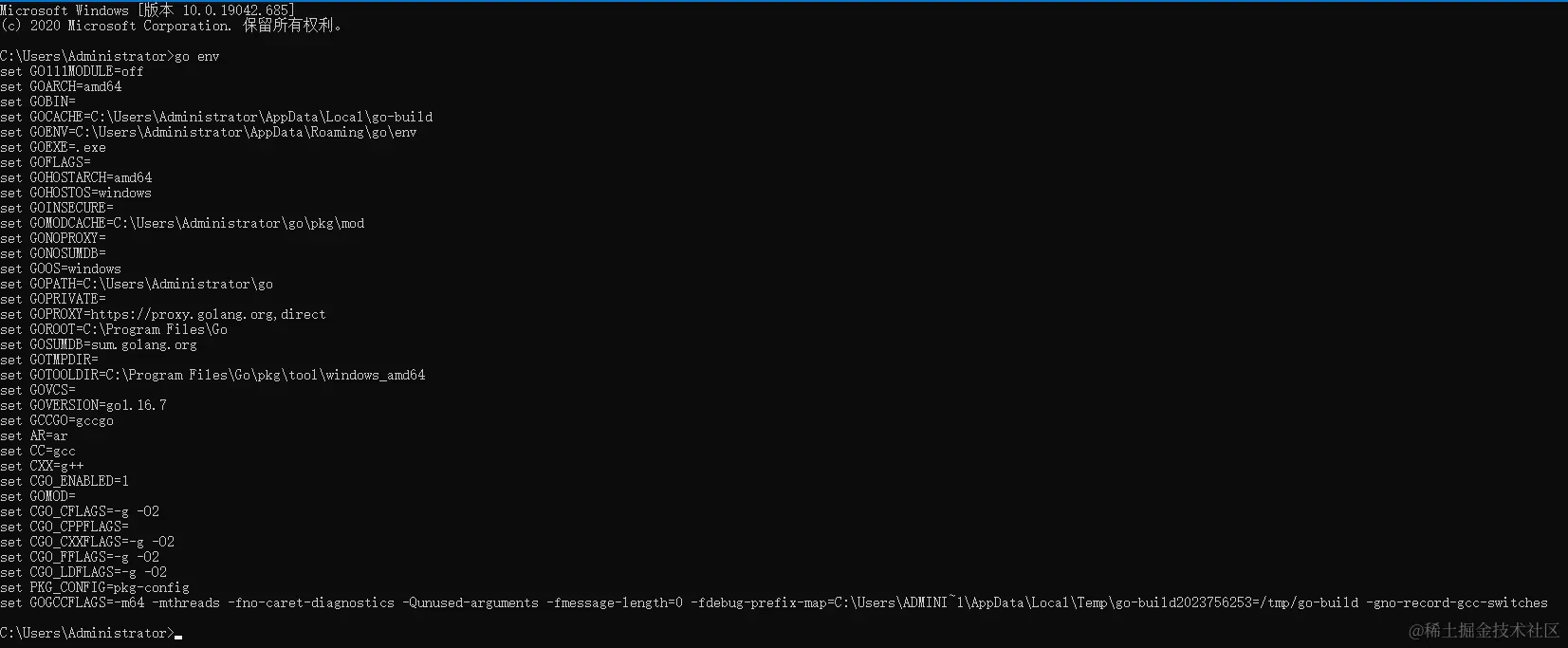 环境变量设置好后,按住Win+R,输入cmd,打开命令提示符,输入go env 命令来进行测试是否安装成功,如果运行出来呈现如下图,则代表安装成功