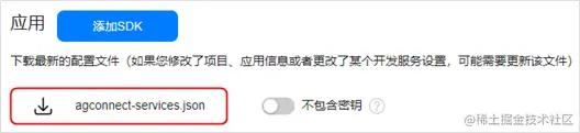 步骤 3:在“项目设置 > 常规”页面的“应用”区域,点击“agconnect-services.json”下载配置文件。