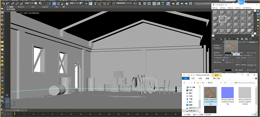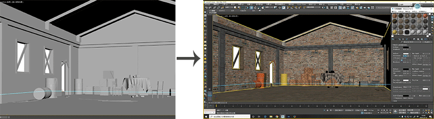 以较为常见的3D游戏所需的复杂场景举例,给一个多物体组合的复杂场景渲染材质,只需如下的简单操作: