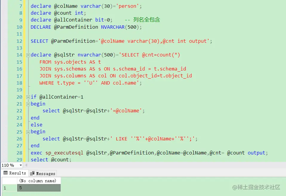 而如何获取动态SQL的执行结果到一个变量中?以备进一步处理,则可以通过执行sp_executesql存储过程实现。