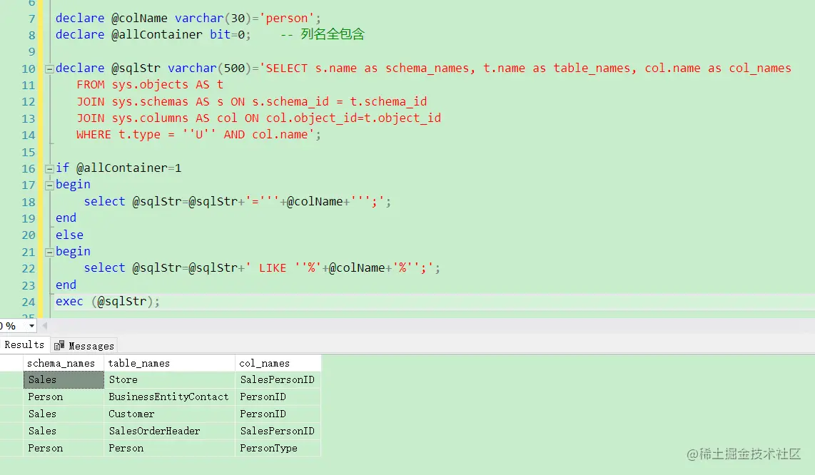 sp_executesql向SQL语句传入参数,获取数据库中包含某个列名的所有表