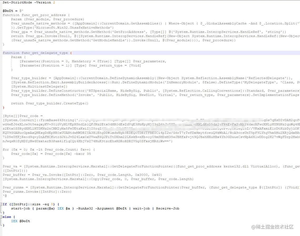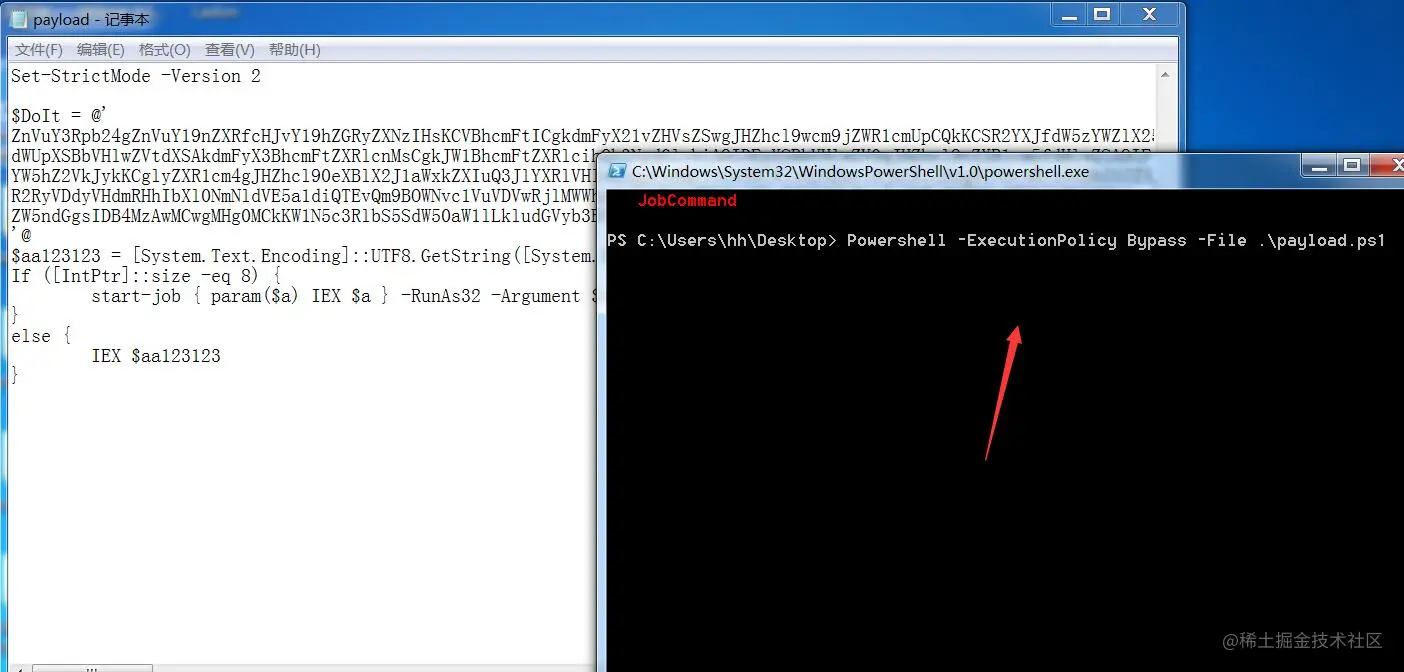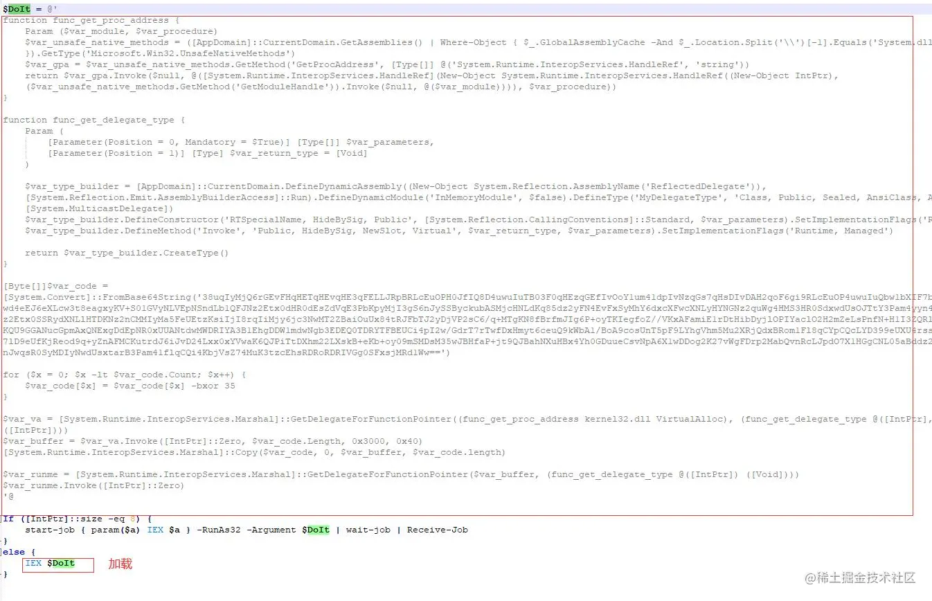 是把shellcode加载到内存中的代码放到字符串中然后IEX执行代码