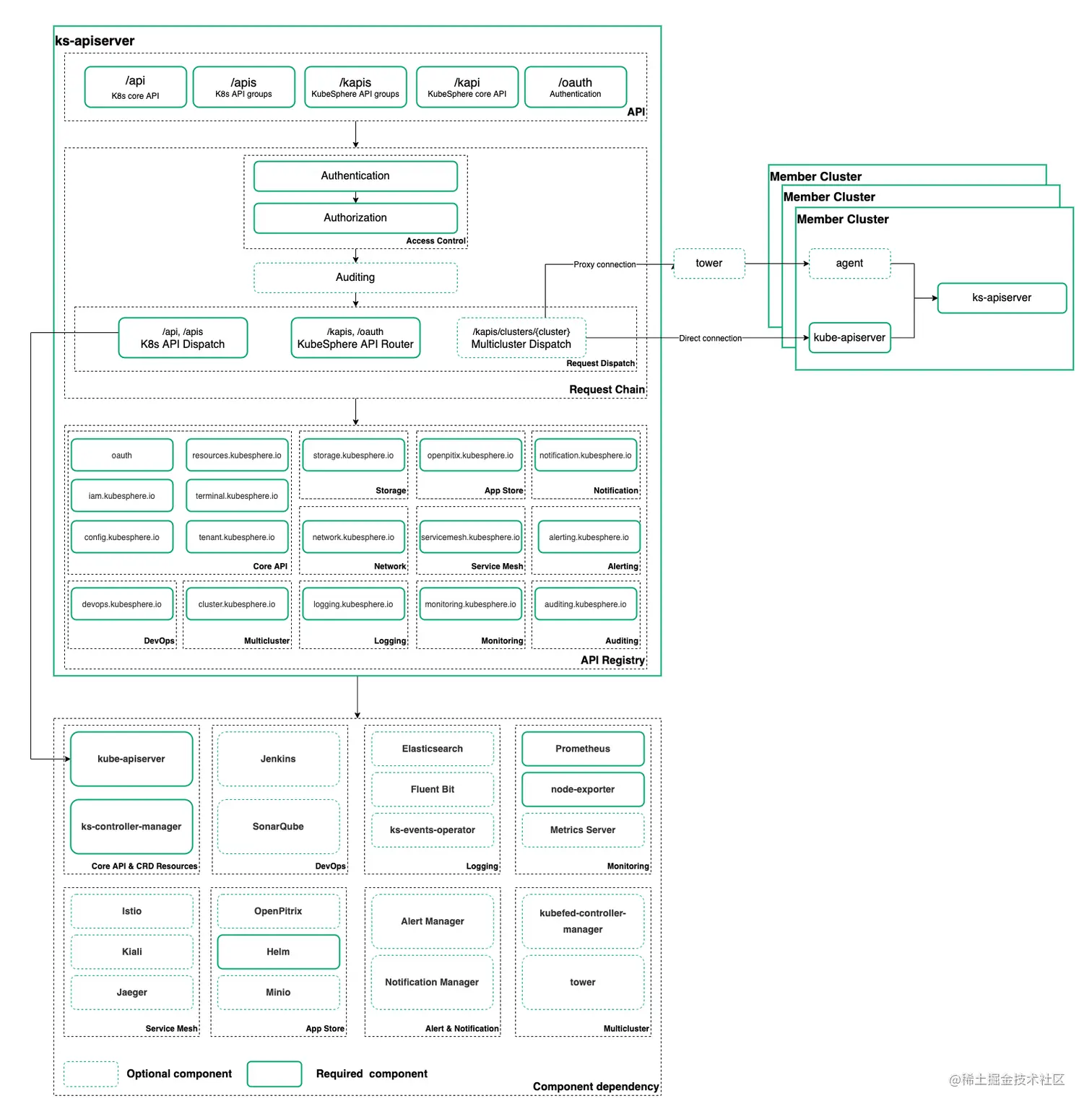 ks-apiserver 是 KubeSphere 核心的后端组件,负责前后端数据的交互、请求的代理分发、认证与鉴权。下图是 ks-apiserver 的核心架构:
