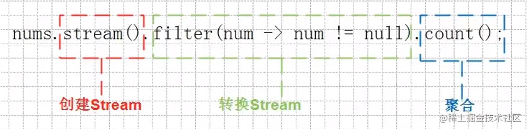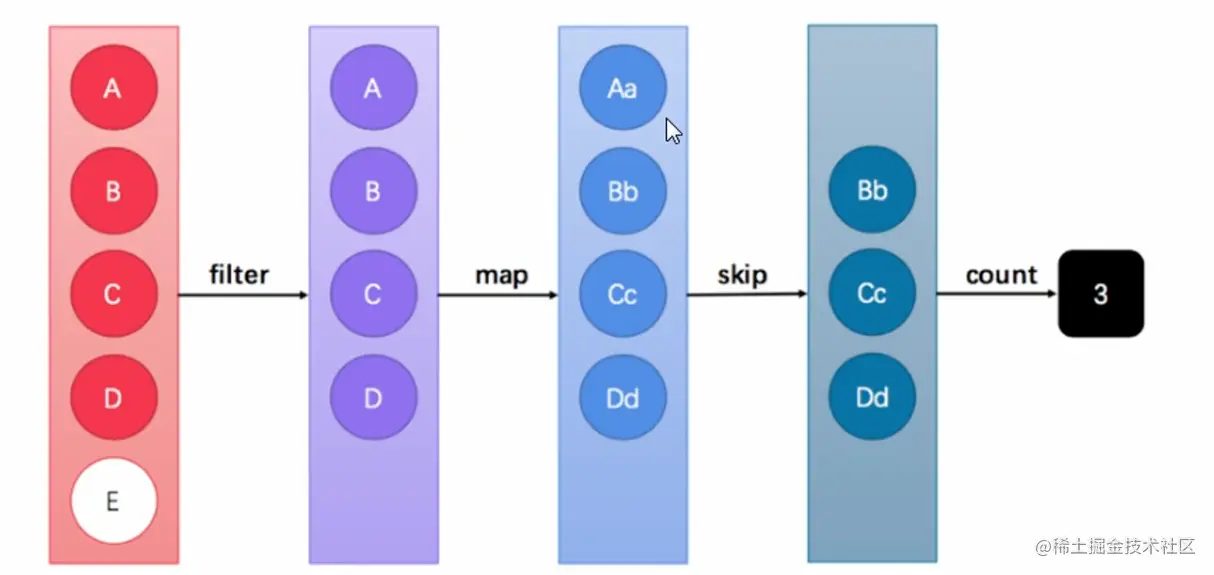 这张图中展示了过滤、映射、跳过、计数等多步操作,这是一种集合元素的处理方案,而方案就是一种“函数模 型”。图中的每一个方框都是一个“流”,调用指定的方法,可以从一个流模型转换为另一个流模型。而右侧的数字 3是终结果。