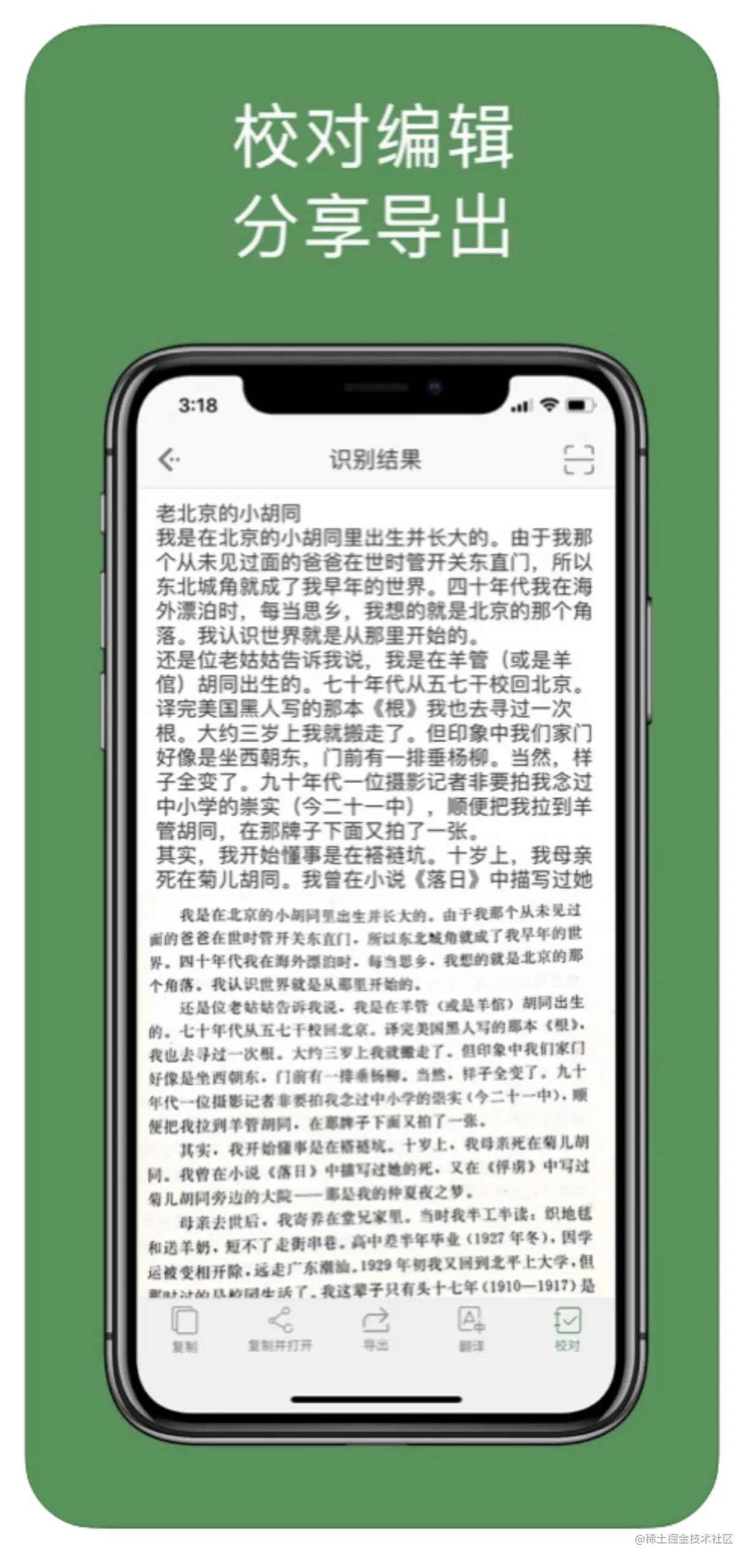 考虑完用户的使用场景之后,再者就是对产品的不断打磨。当时,图片转文字常常会有识别错误的情况发生,为了弥补这一问题,在识别之前,白描APP会进行一些技术上的处理,比如图像压缩如何保证清晰度又尽量减小图片大小;如何在进行长图自动裁剪时,检测到长图的空行位置自动裁剪,且不会裁到文字;如何针对文章进行自动分段,更便于读者阅读等等。这些精细化的产品设计保证了图片的清晰度,让文字信息更易于被识别。而在识别之后,白描的校对功能,可以让识别结果与原图显示在同一界面上,方便用户快速找到需要修改的地方,在此基础上进行编辑。