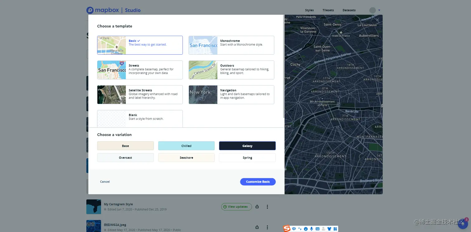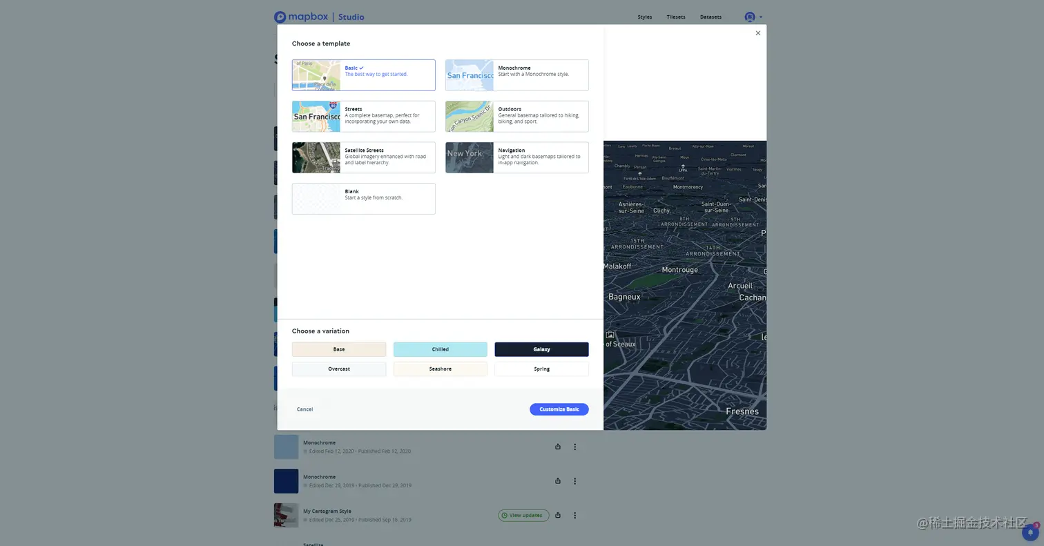 可以从官方模版选择,或者从自己历史中选择一个,这里我选择了一个Basic > Galaxy的模板