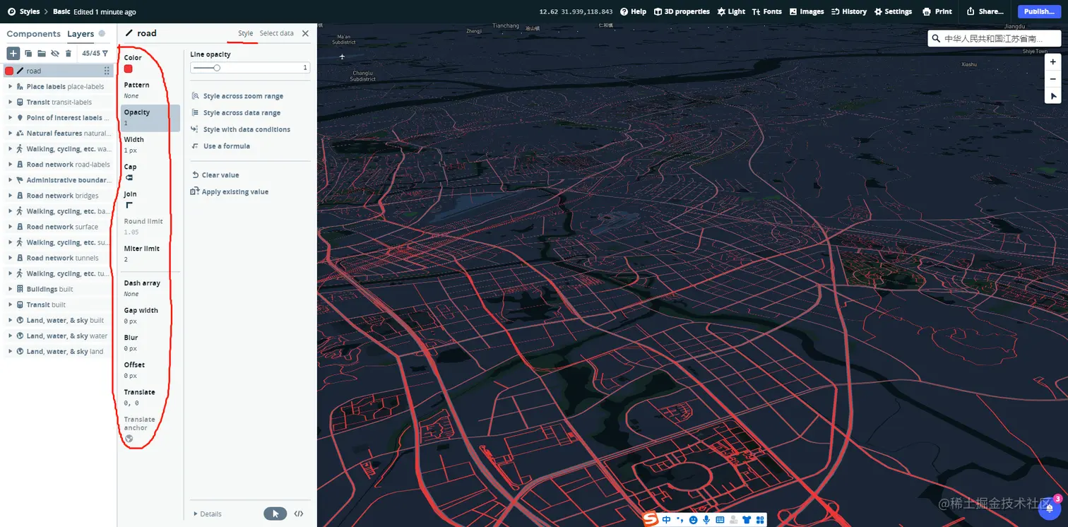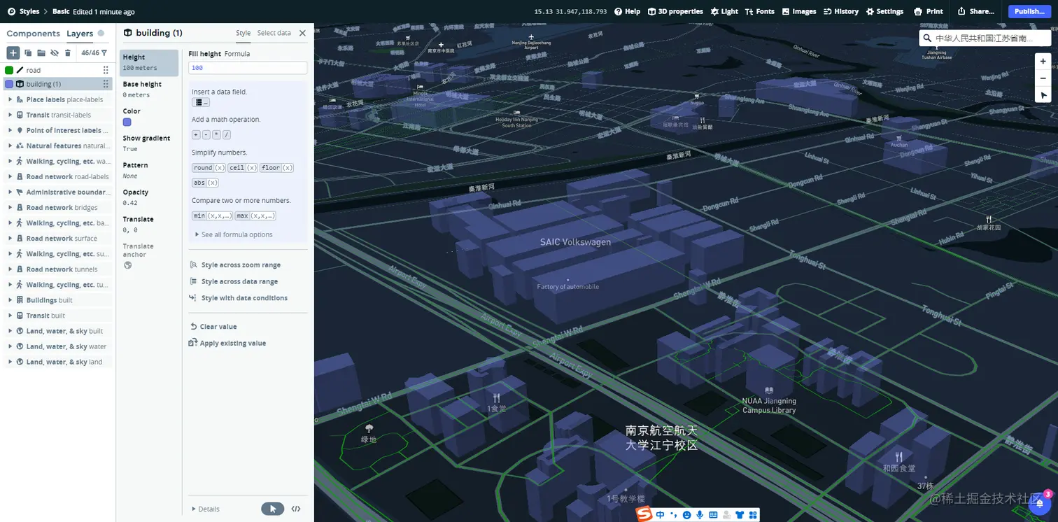 这里选择 Fill extrusion,然后切换回 style,你会看到所有的建筑都变成黑色的了。style 中可以设置建筑的颜色透明度高度等...也可以自定义计算的方式去设置建筑物的高度,这个自行摸索啦💪💪💪