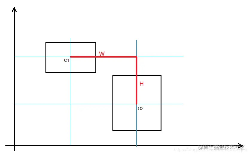 分别计算两个矩形的中心点 O1,O2,以及 O1 和 O2 之间的水平距离(w)和竖直距离(h)。