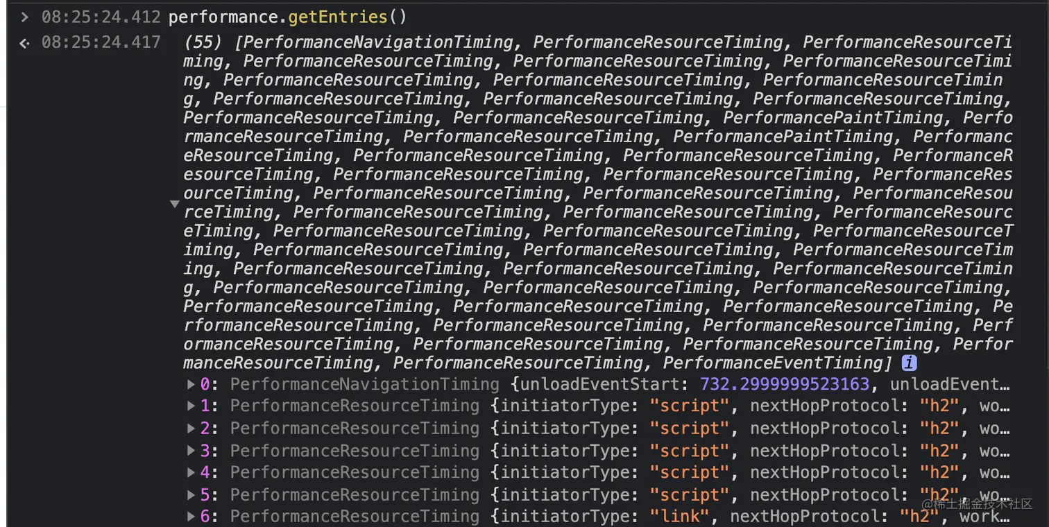 - getEntries方法:通过该方法,我们能够拿到页面所有资源请求的详细情况,这个方法返回值根据传入的参数不同会有不同。但返回值的结构都是一样的,都是一个对象数组,每个对象是对资源的请求过程的描述,在console调用 performance.getEntries(),可以直接看到当前页面所有资源的加载过程。