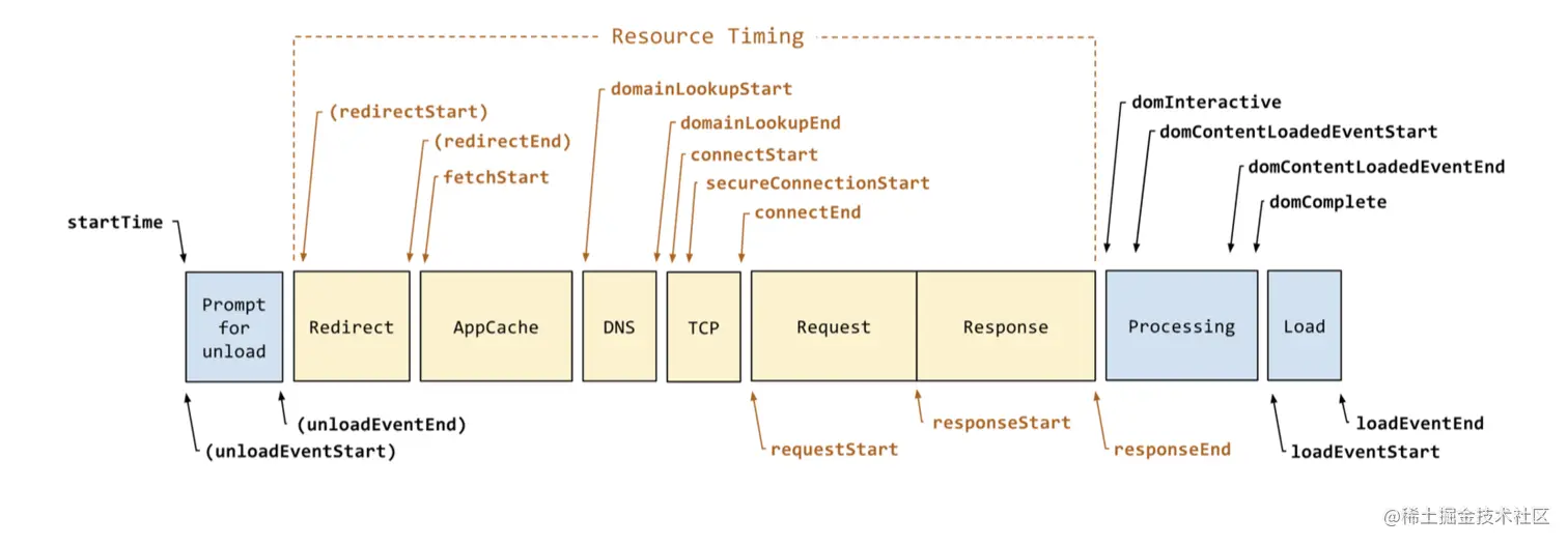 timing:提供页面加载过程中一系列关键时间点的高精度测量,它包含了网络、解析、加载等一系列的时间数据,我们监控网页性能也是基于此提供的属性。为了方便理解,从网上找了一张图片来解释关键节点的含义。