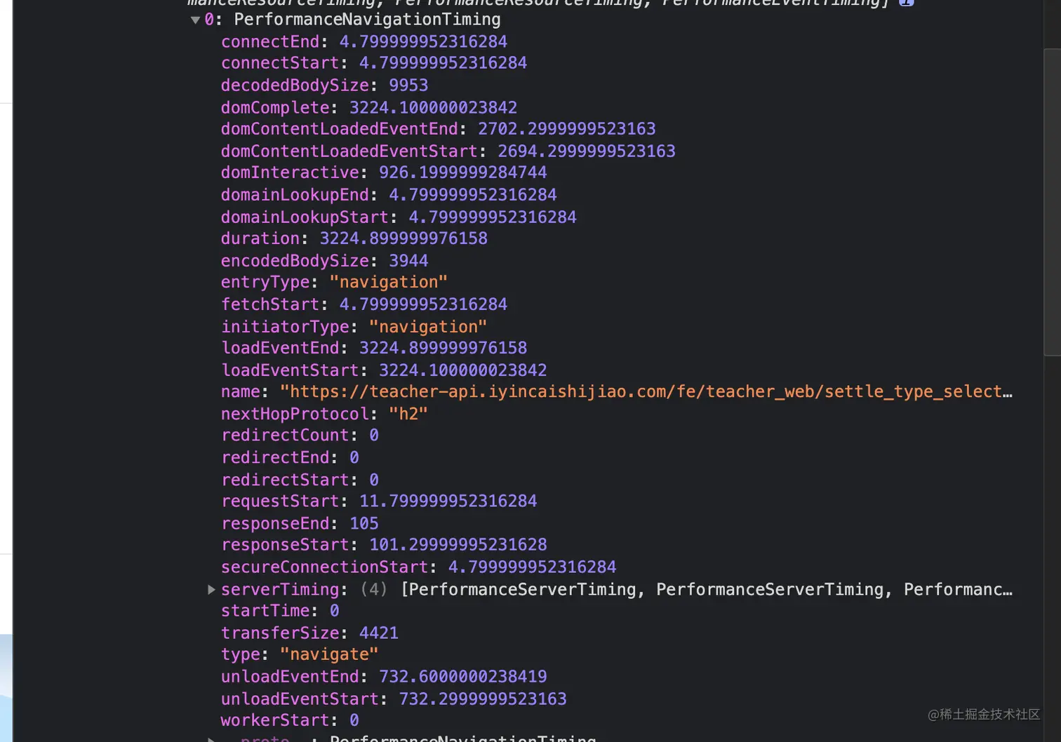 点开数组中的元素,每个元素详细记录了资源请求关键节点的时间,所以我们完全可以利用这个来实现对资源的请求监控。