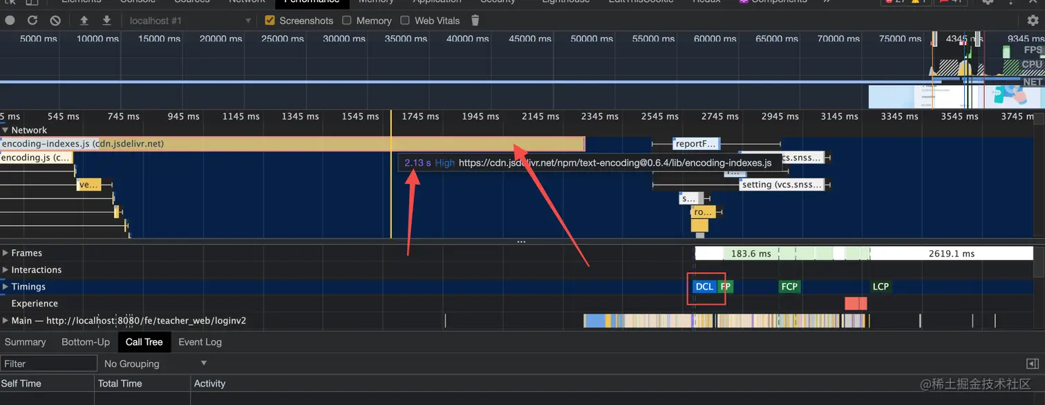 通过观察NetWork的情况,很明显看到 DCL的时机,在一个encoding.js文件加载完成后,再触发的,而这个文件的加载时间长达 2.13s,可谓是占据了首页加载的80%左右的时间,那么就想如何优化这个脚本的加载时长?有几种思路