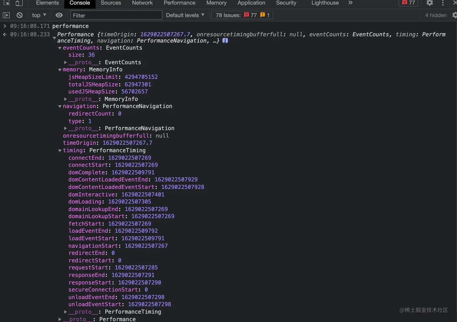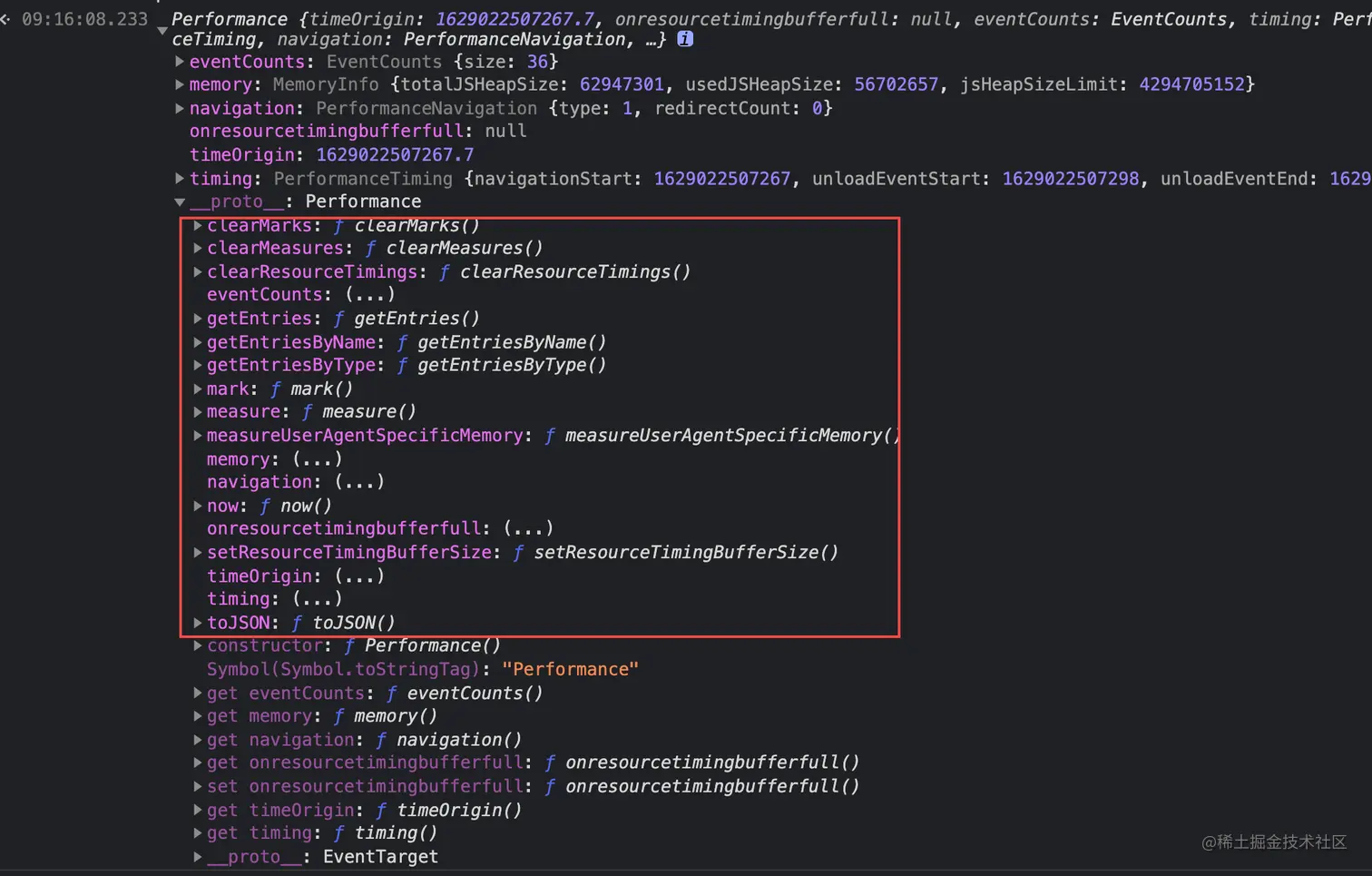 如上图,截取的图片,Performance提供了一些,这里我主要介绍一下now()方法和getEntries()方法。其他的网上资料也比较多和全,可以查阅 juejin.cn/post/684490…