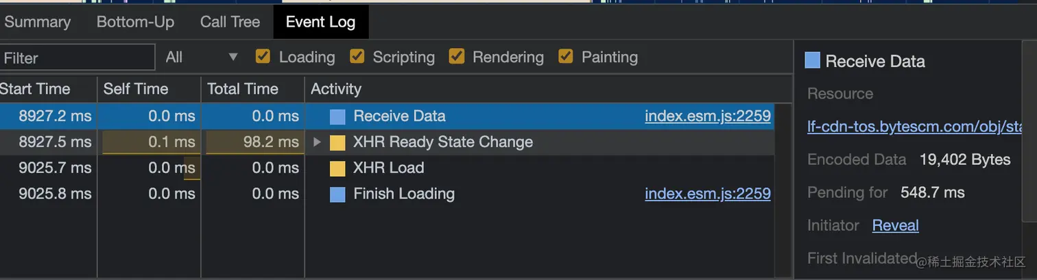 - Event-Log面板:展示所有阶段包括loading、javascripting、rendering、painting中各事件的耗时情况,并提供了filter输入框和按钮供你快速过滤,常见的优化级别中一般用不到它。