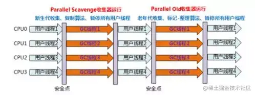 Parallel Old收集器的出现,使“吞吐量优先”收集器终于有了名副其实的组合。在吞吐量和CPU敏感的场合,都可以使用Parallel Scavenge/Parallel Old组合。组合的工作示意图如下: