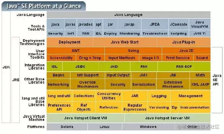 从上图能清晰看到Java平台包含的各个逻辑模块,也能了解到JDK与JRE的区别。