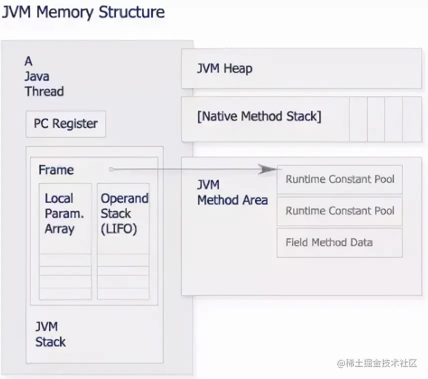 JVM栈是线程私有的,每个线程创建的同时都会创建JVM栈,JVM栈中存放的为当前线程中局部基本类型的变量(java中定义的八种基本类型:boolean、char、byte、short、int、long、float、double)、部分的返回结果以及Stack Frame,非基本类型的对象在JVM栈上仅存放一个指向堆上的地址。