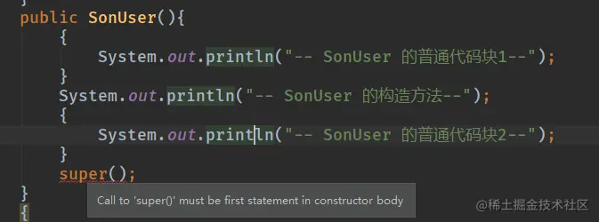 我也想把父类的构造方法放在最下面,但是却只看到了 IDEA 的无情爆红,当然也是执行不了的。如果不加 super() 那就会默认加一个空参数的父类构造方法,也就是super()。