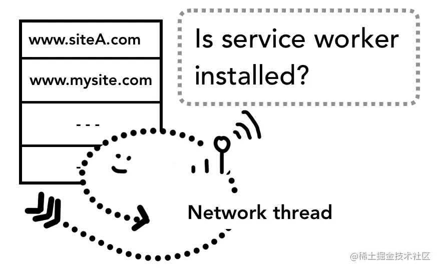 注册 Service Worker 后,Service Worker 的作用域将作为参考保留(你可以在这篇 The Service Worker Lifecyle 文章中阅读有关作用域的更多信息)。当导航发生时,网络线程会根据已注册的 Service Worker 范围检查域,如果 Service Worker 已为该 URL 注册,则 UI 线程会查找渲染器进程以执行 Service Worker 代码。Service Worker 可能会从缓存中加载数据,从而无需从网络请求数据,或者它可能会从网络请求新资源。