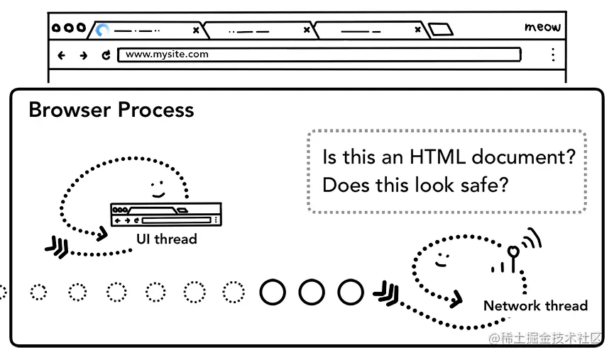 当用户开始在地址栏中键入内容时,UI线程首先询问的是“这是搜索查询还是URL?”。在Chrome中,地址栏也是一个搜索输入字段,因此UI线程需要解析并决定是将你发送到搜索引擎,还是发送到你请求的站点。