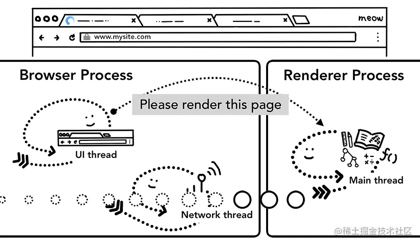 正如我们在第1部分:CPU、GPU、内存和进程架构中介绍的那样,选项卡之外的所有内容都由浏览器进程处理。浏览器进程有一些线程,比如绘制浏览器按钮和输入字段的UI线程,处理网络堆栈以从Internet接收数据的网络线程,控制对文件等访问的存储线程。当你在地址栏中输入URL时,你的输入由浏览器进程的UI线程处理。