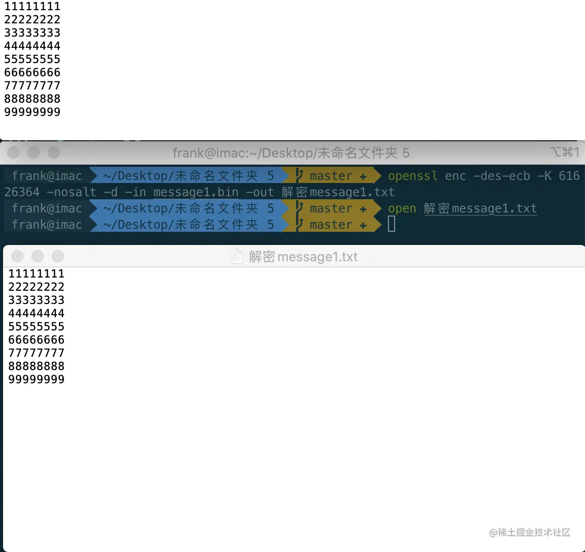 5、终端输入openssl enc -des-ecb -K 61626364 -nosalt -d -in message.bin -out 解密message1.txt 解密二进制文件并输出解密后的文件