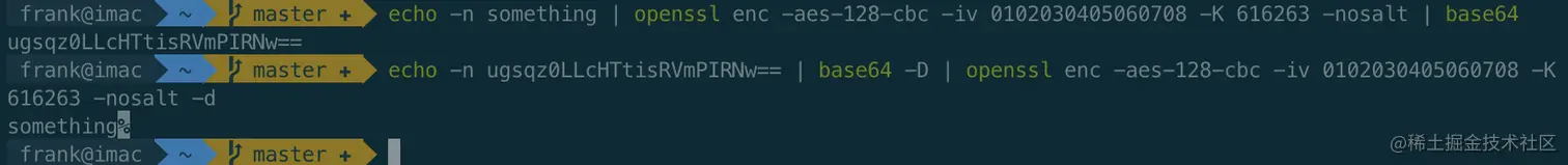 echo -n "需要加密的字符串" | base64 -D | openssl enc -aes-128-cbc -iv "向量" -K "密钥" -nosalt -d