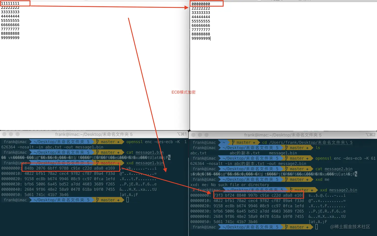 通过加密后二进制结果可以看出cbc模式只是修改位置的二进制发生了改变,ECB模式修改位置后面的二进制都发生了改变