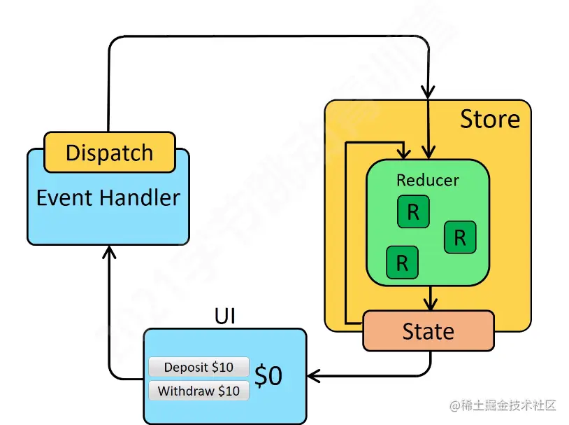 接收到Event Handler的Dispatch之后,并不会立即将Dispatch发送传给reducer,而是被中间件拦截,中间件会再向Reducer发送Action.