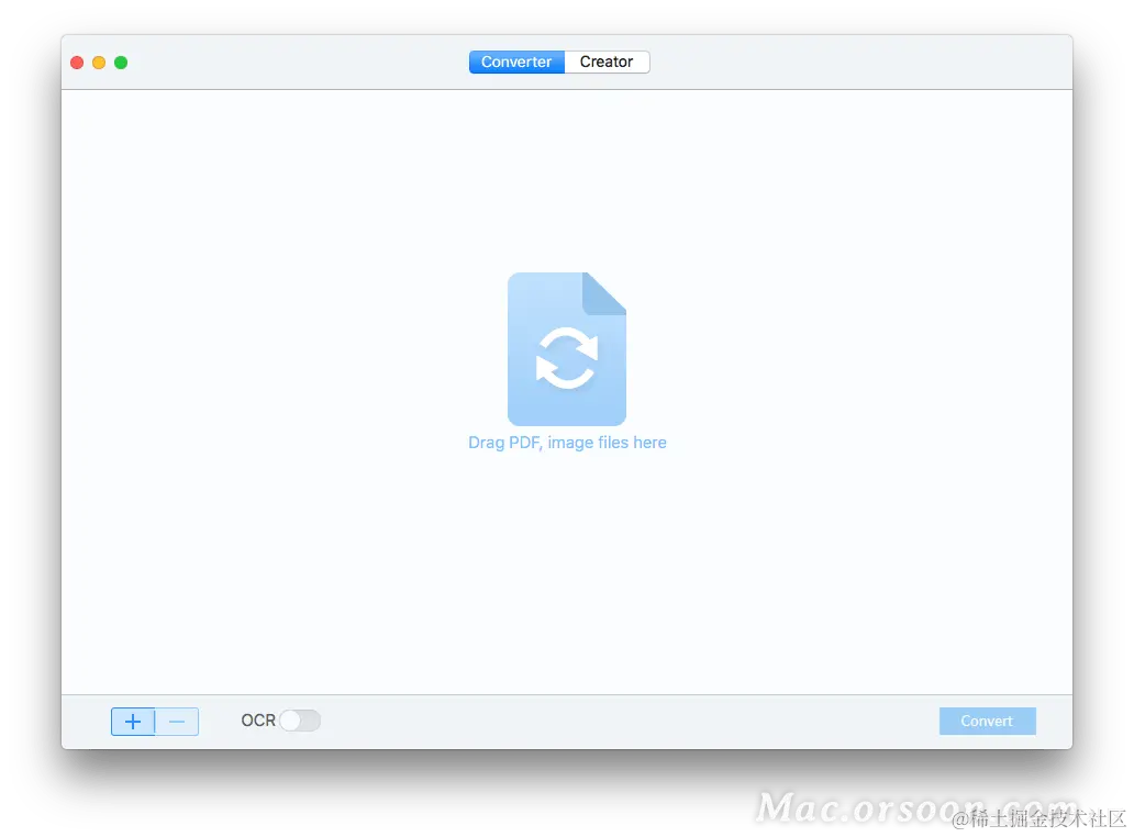 将PDF文件拖放到“转换器”界面,也可以点击程序底部的“+”图标添加。